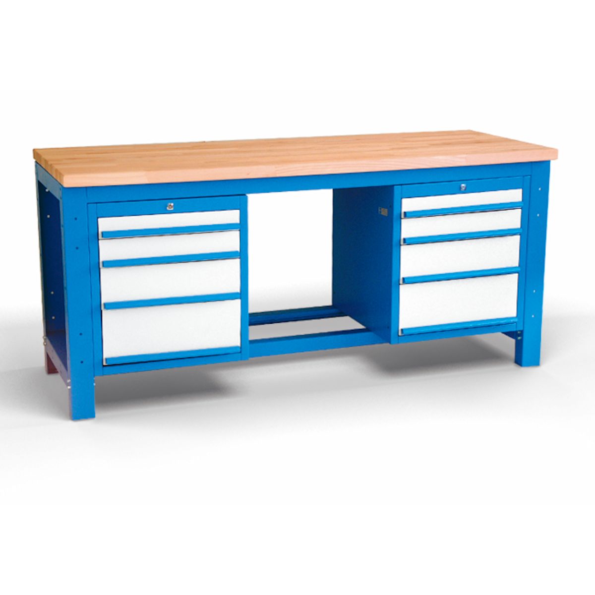 40 mm vastagságú munkalap, rétegelt lemez, vagy műanyaggal kasírozott munkalap kidolgozással; könnyen gördülő, golyókosaras fióksín; központi zár; állítható magasságú polc; 100%-ig kihúzható, 80 kg-ig terhelhető fiókok.