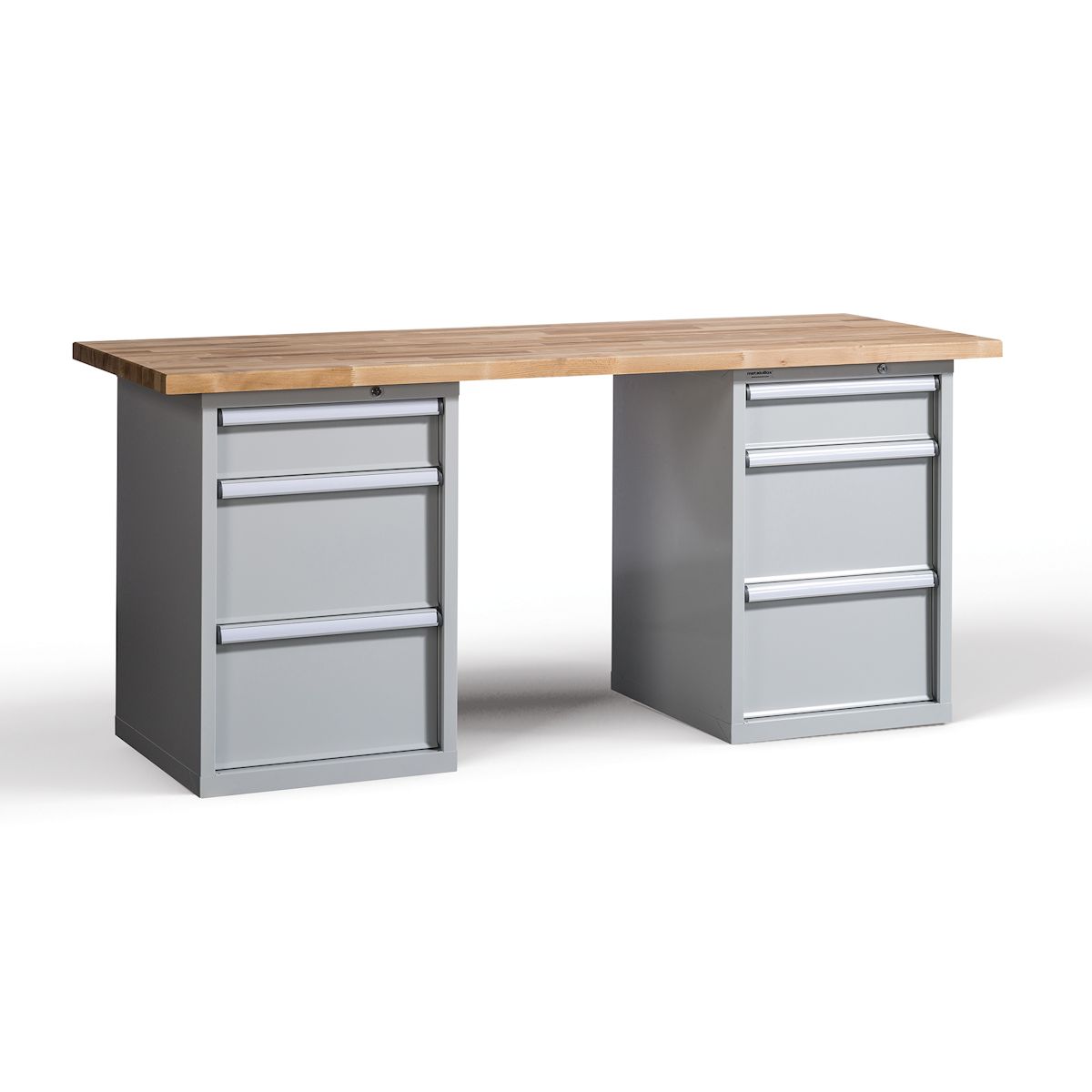 Lekerekített élek; biztonsági zár (két kulccsal); 90 % - ig kihúzható, 70 kg - ig terhelhető fiókok; 40 mm vastagságú, magas minőségű, stabil bükk munkalap, 800 kg teherbírással; stabil, V-alátámasztású lábrögzítés; visszahajtott U-profilú lábkialakítás a nagyobb teherbírás érdekében; padlóvédő és stabilitást növelő alátámasztással ellátott lábak; talajhoz rögzíthető kialakítás a még nagyobb stabilitásért.