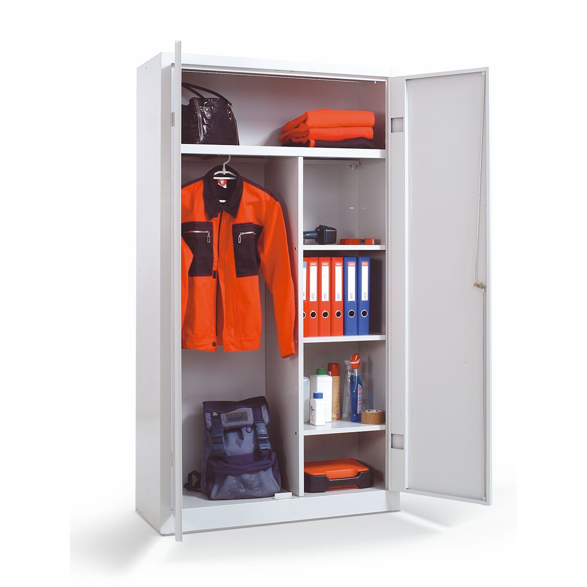 2 ponton záródó biztonsági zár (két kulccsal); középen válaszfal; 3 db állítható magasságú polc; 1 db vállfatartó rúd.