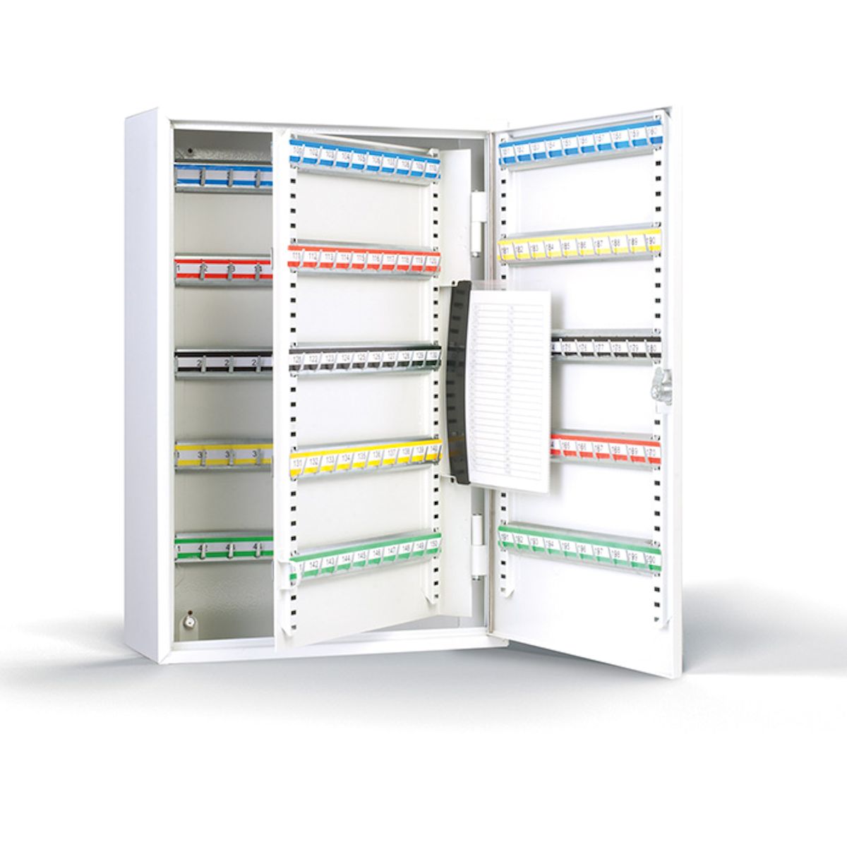 Biztonsági zár (két kulccsal); galvanizált kulcstartó kampók; állítható magasságú, számozott, színes kulcstartó sínek; beépített kulcsnyilvántartó füzet.